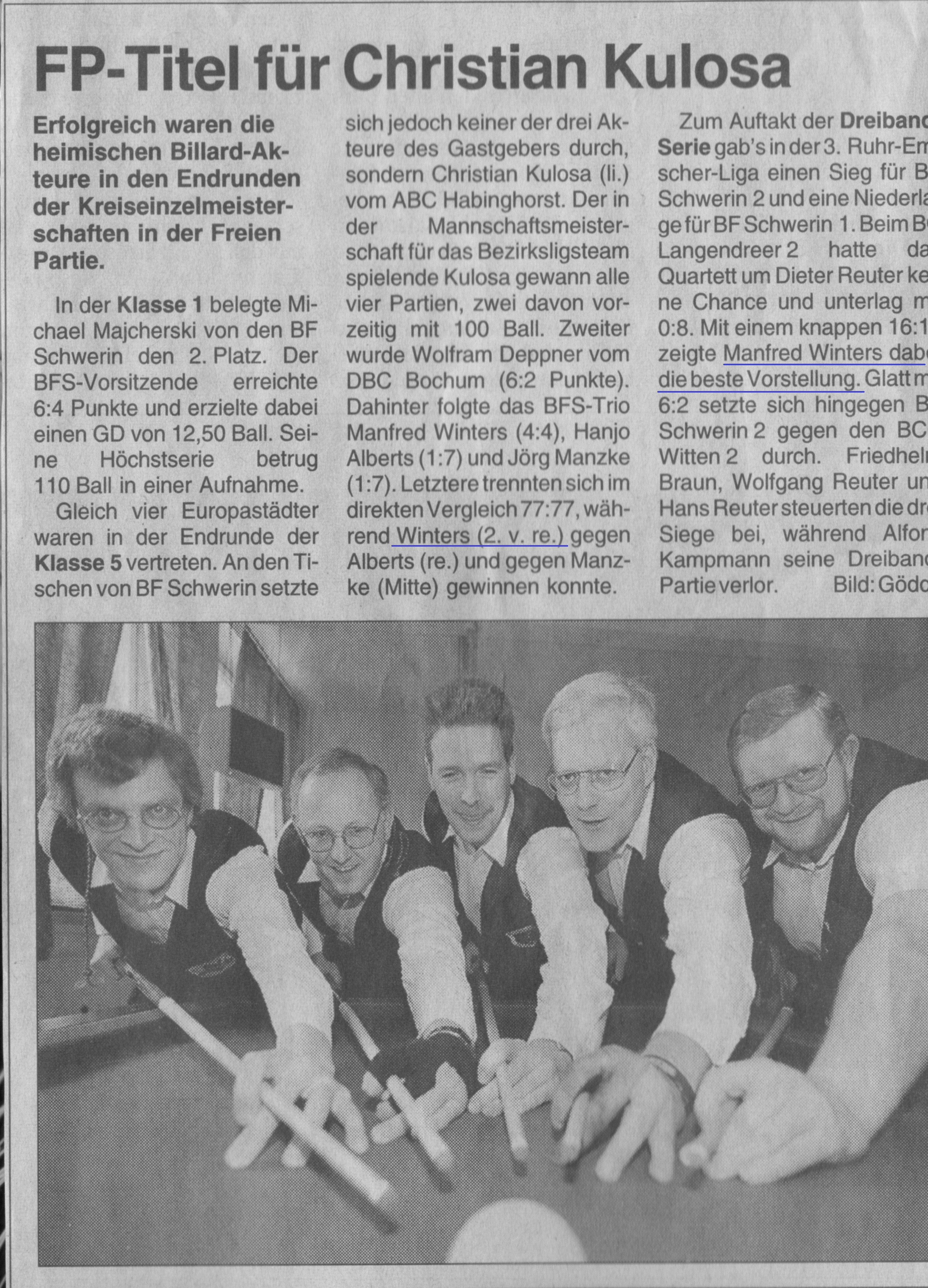Ende 2001 war ich in der 3. Mannschaft der Bfr. Schwerin in der Bezirksklasse erfolgreich aktiv,