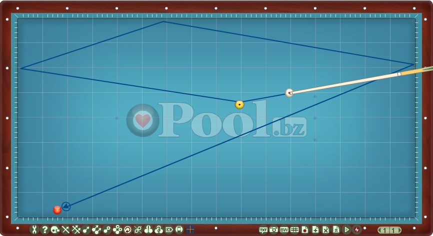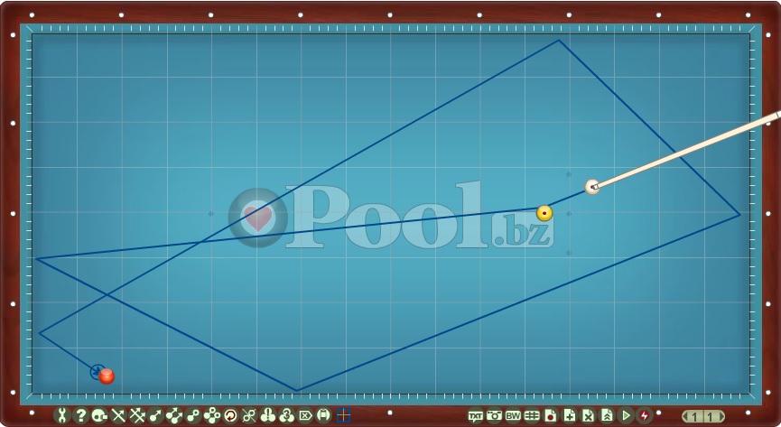 Jedes Beispiel beinhaltet den Stoßpunkt an Ball 1 sowie den Tangierungspunkt von Ball 1 an Ball 2.